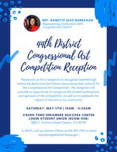Join us on Saturday, May 11, 2019 from 10:00AM–11:30AM at California State University, Dominguez Hills for our 44th District Congressional Art Competition Reception! This is an opportunity to view the…
